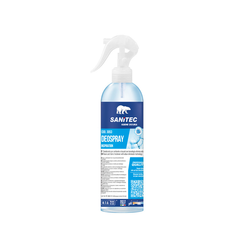 DEO SPRAY 300ml. Deodorante per ambienti e tessuti. La sua particolare formulazione neutralizza le molecole dei cattivi odori e garantisce una persistente profumazione negli ambienti trattati.