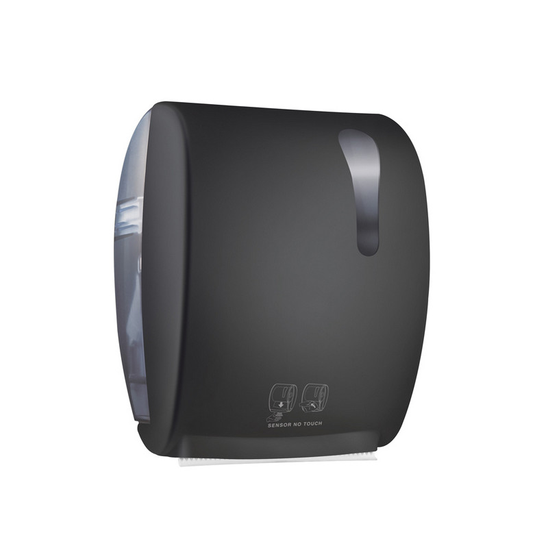 Dispenser in ABS ad erogazione con rilevatore di prossimità e trascinamento elettronico. Capacità max bobina asciugamani: H220mm -Ømax 200mm.Meccanismo regolabile: lunghezza di strappo, ritardo tra un'erogazione e l'altra e range del sensore. Come funziona: l'utente, avvicinando le mani al dispenser, attiva il rilevatore di prossimità. Il rilevatore mette in azione il trascinamento elettrico del rotolo (nr. 3 regolazioni di lunghezza da 25, 35 e 45 cm.). L'utente si ritrova un lembo da tirare verso di se che si taglia con un seghetto nascosto e protetto sotto il coperchio del dispenser. Alimentazione solo a batterie (4pile D). Versione a rete non più disponibile.