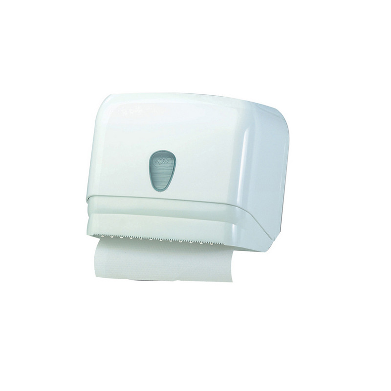"Dispenser colore bianco con lente riserva per asciugamani in carta. Puo' contenere sia il rotolo (dimensioni massime diametro 155mm h240mm) o i fogli intercalati piegati a ""C"" o a ""V"". Dimensioni dispenser: h251xp195xl300mm."