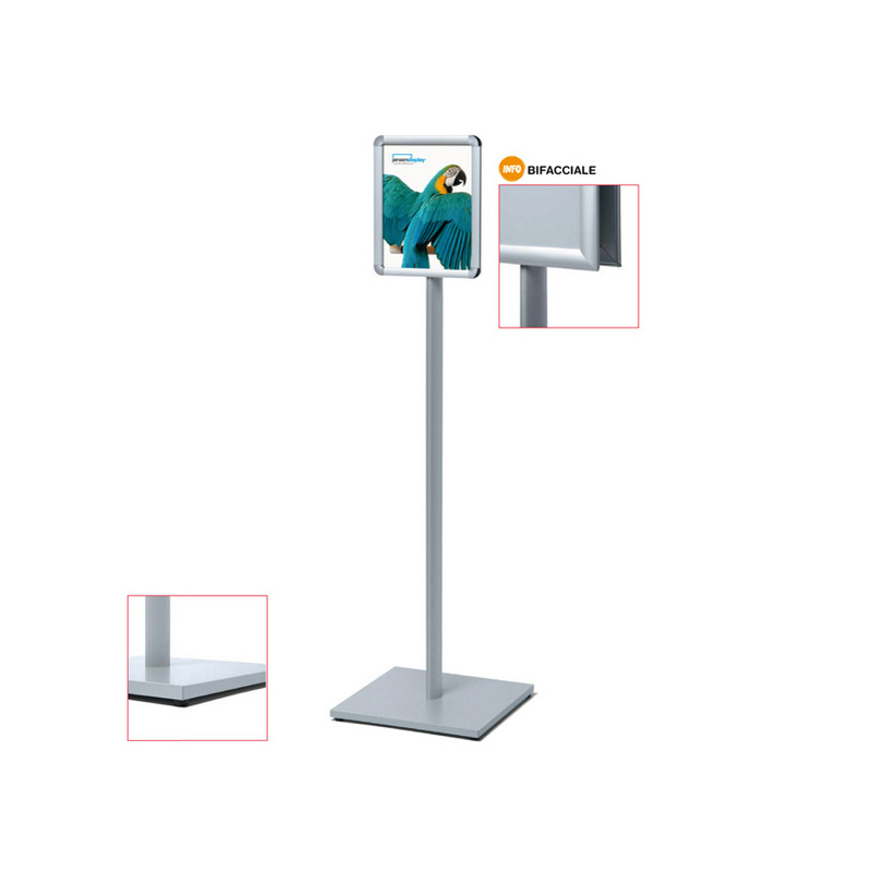 Display bifacciale su stand in alluminio. Il display è formato da 2 cornici a scatto con angoli arrotondati. Ideale in tutti gli ambienti in cui sia necessario esporre comunicazioni pubbliche in modo efficace. Altezza totale 140cm.