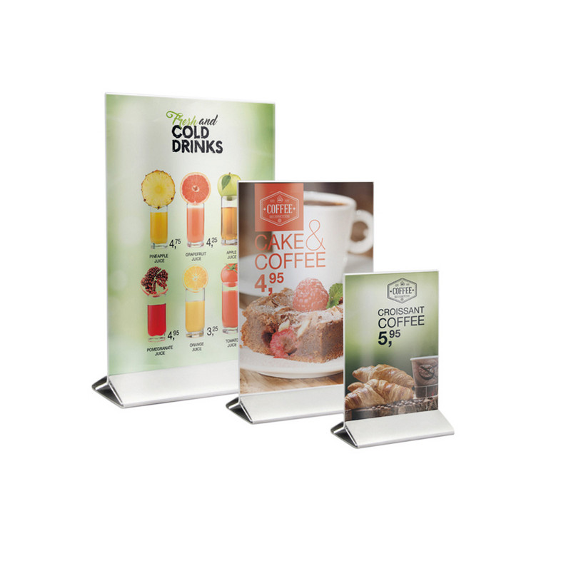 Display da tavolo in acrilico utilizzabile su due lati, facile da pulire e con base in acciaio inossidabile. Robusto ed elegante. Formato A5 (15x21cm).