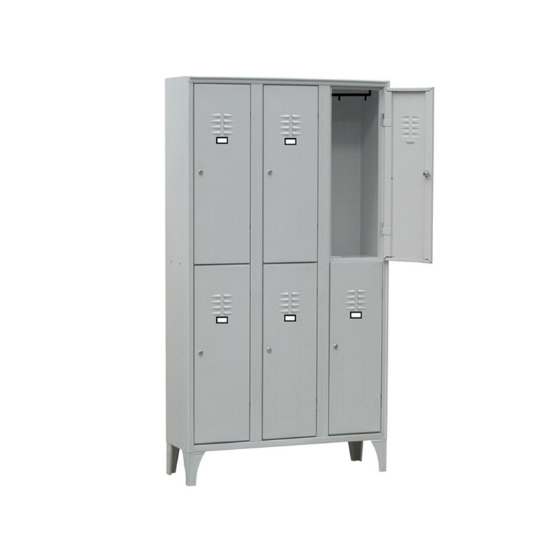 Armadio a 6 vani sovrapposti. Ogni vano è dotato di tubo ovale porta grucce in PVC completo di ganci scorrevoli non estraibili. Porta cartellino in materiale plastico applicato all’anta. Chiusura con serratura a cilindro con doppia chiave in dotazione. Fornito montato.