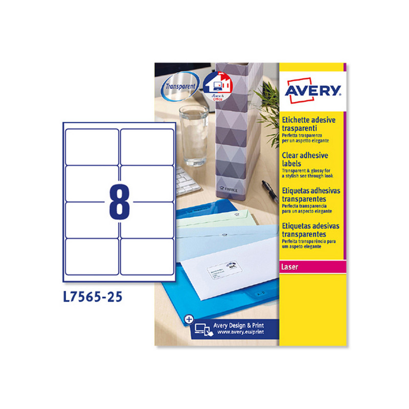Scatola da 25 fogli in formato A4 in poliestere trasparente adesivo. Etichette rettangolari con angoli tondi per stampanti laser e laser a colori. Tecnologia QuickPEEL™