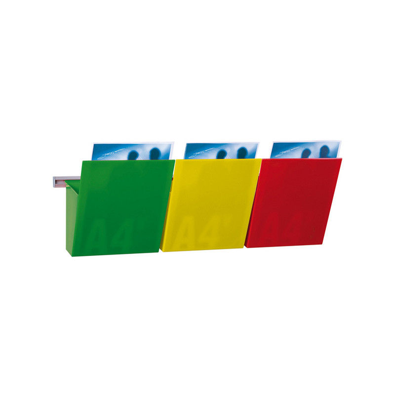 Pratico sistema portadocumenti a parete che utilizza il linguaggio del SEMAFORO per avere sempre una scrivania organizzata e risparimiare tempo nella ricerca dei documenti. Kit composto da 3 Vaschette rosso, giallo, verde agganciate su barra in alluminio 75cm completa di fori e fisher per il fissaggio. Per un lavoro organizzato: ROSSO -pratiche urgenti. GIALLO - pratiche in lavorazione. VERDE - pratiche chiuse. DIMEnsioni:L75 x H25 x P11cm - 3 tasche A4 colorate