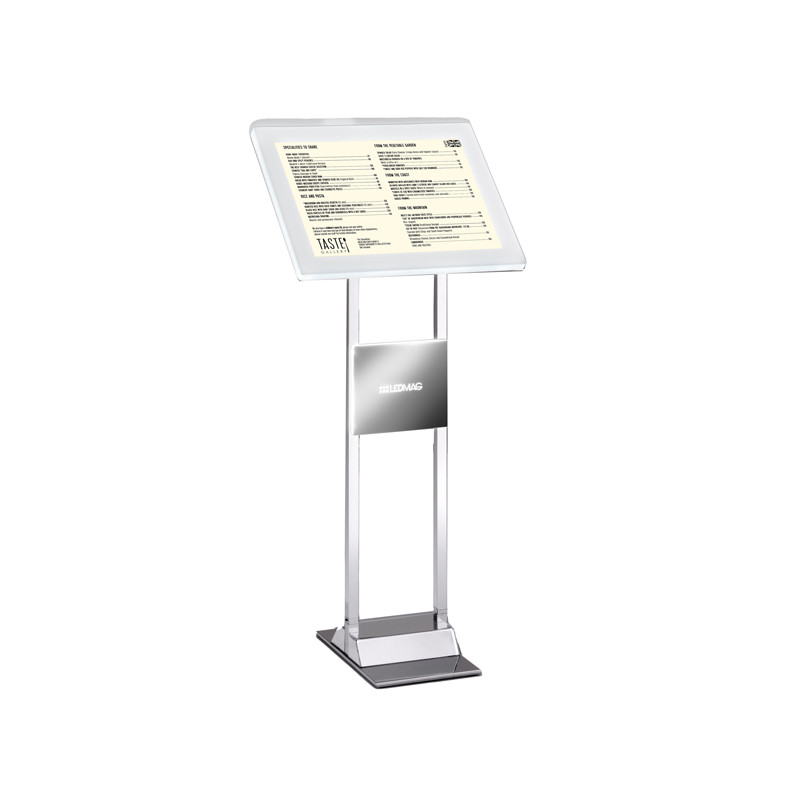 Comodo e pratico leggio da interno con cornice LEDMAG retroilluminata a LED formato A4 verticale/orizzontale. Piantana in acciaio metalizzato, alimentatore interno da 40w. H 110cm; P 40cm. Ideale per ristoranti, sale riunioni, agenzie, spazi espositivi in genere.