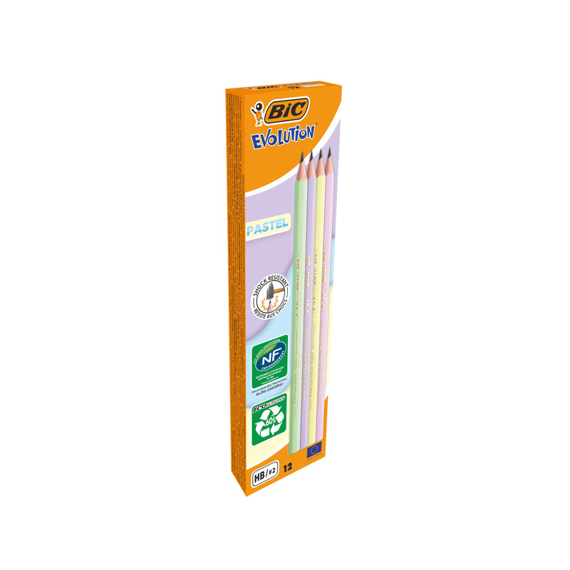 Matite in grafite in resina senza legno. Fusti in colori assortiti in 4 tonalità pastello. Facili da temperare. Non fanno schegge se spezzate. Mina ultraresistente. Difficili da rosicchiare. Realizzate con materiali riciclati (60% senza gommino). Certificazione ecologica NF Environment.