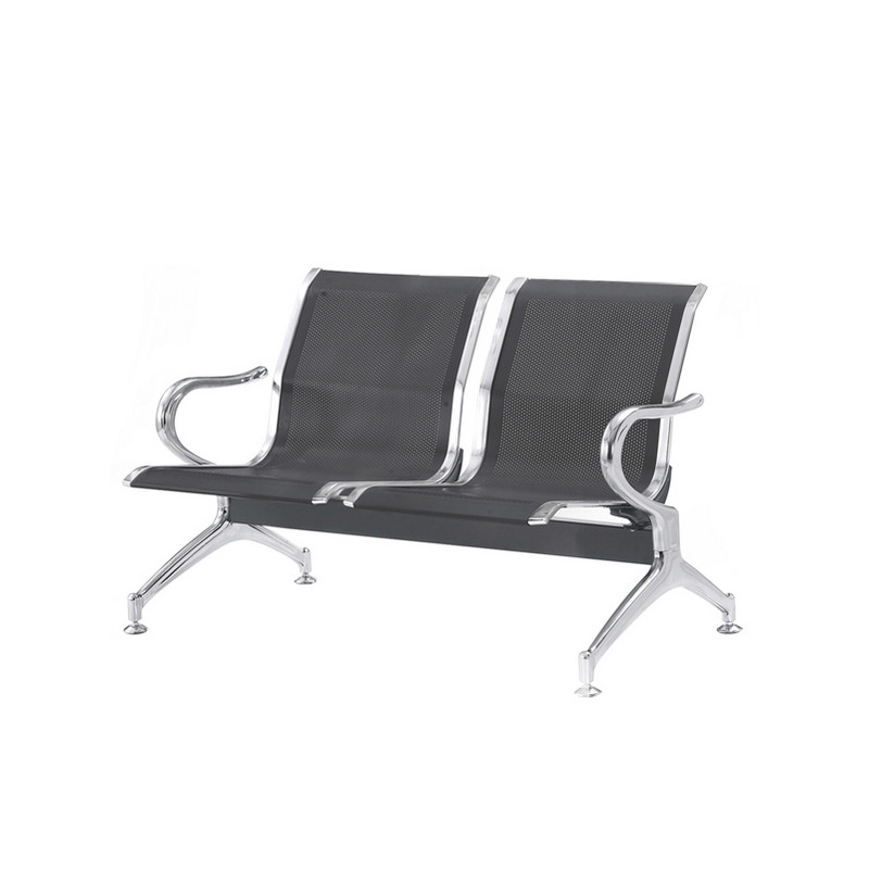 Panca per sala d'attesa in acciaio microforato con trattamento antiruggine e verniciatura elettrostatica. Spessore lamiera 1,5mm. Profili, gambe e braccioli in acciaio cromato.