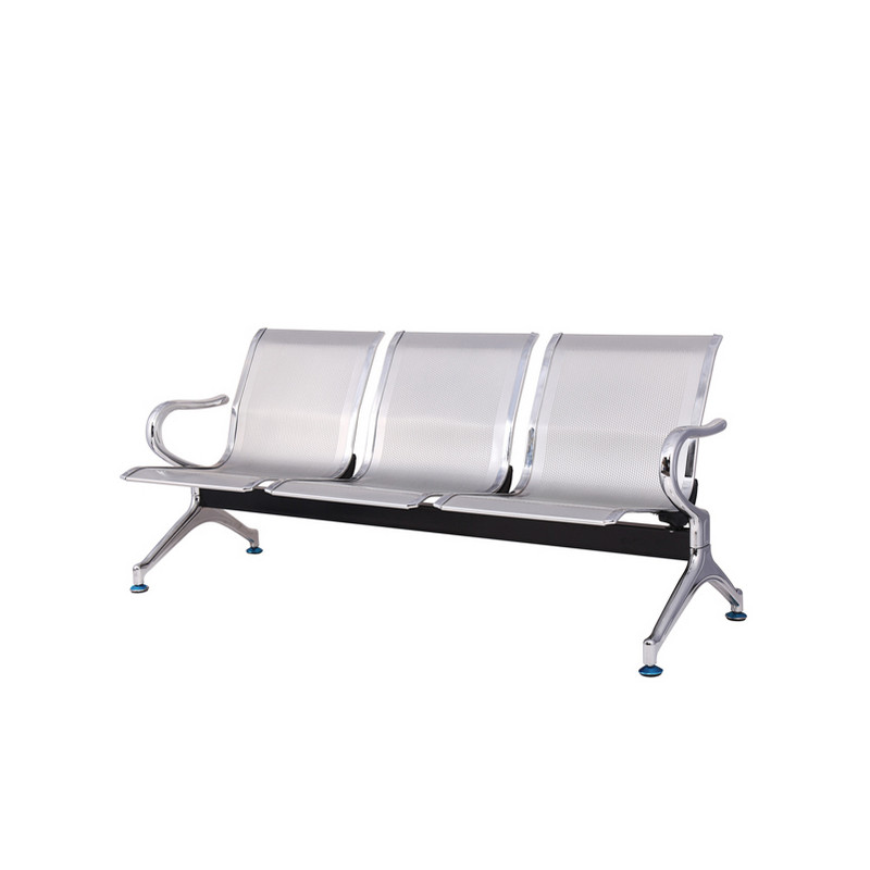 Panca per sala d'attesa in acciaio microforato con trattamento antiruggine e verniciatura elettrostatica. Spessore lamiera 1,5mm. Profili, gambe e braccioli in acciaio cromato.