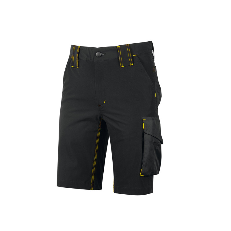 Bermuda Slim-Fit in tessuto U-4 Way Stretch resistente e morbido sulla pelle con triple cuciture. Dotato di due ampie tasche anteriori, elastico in vita con regolazione a scomparsa. Chiusura centrale con zip e bottone gommato antigraffio. Carrè posteriore accentuato per una maggior protezione della parte lombare e nastro reflex su passante tubolare posteriore. Tasca laterale porta utensili, due tasche posteriori di cui una con pattina e una con chiusura di sicurezza a velcro. Con tasca multifunzionale con porta badge a scomparsa. Tessuto idrorepellente, traspirante e ad asciugatura rapida. Su ordinazione tutte le taglie da XS a 5XL.