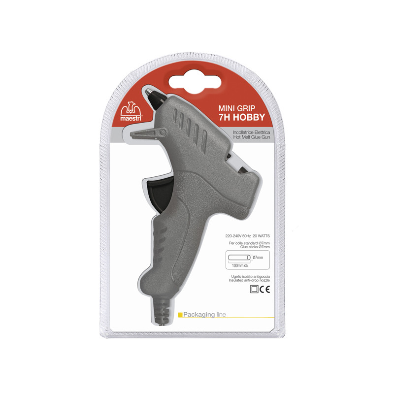 Potenza 10W. Tensione d’utilizzo: 220/240V - 50 Hz. Dimensioni: 134 x 95mm. Peso: 0,15 Kg. Regolazione temperatura: PTC. Dimensioni stick colla: Ø 7mm. Tempo di esercizio:170/190°C. Tempo aperto: 15/20sec. Ugello: isolato antigoccia. Cavalletto d'appoggio.