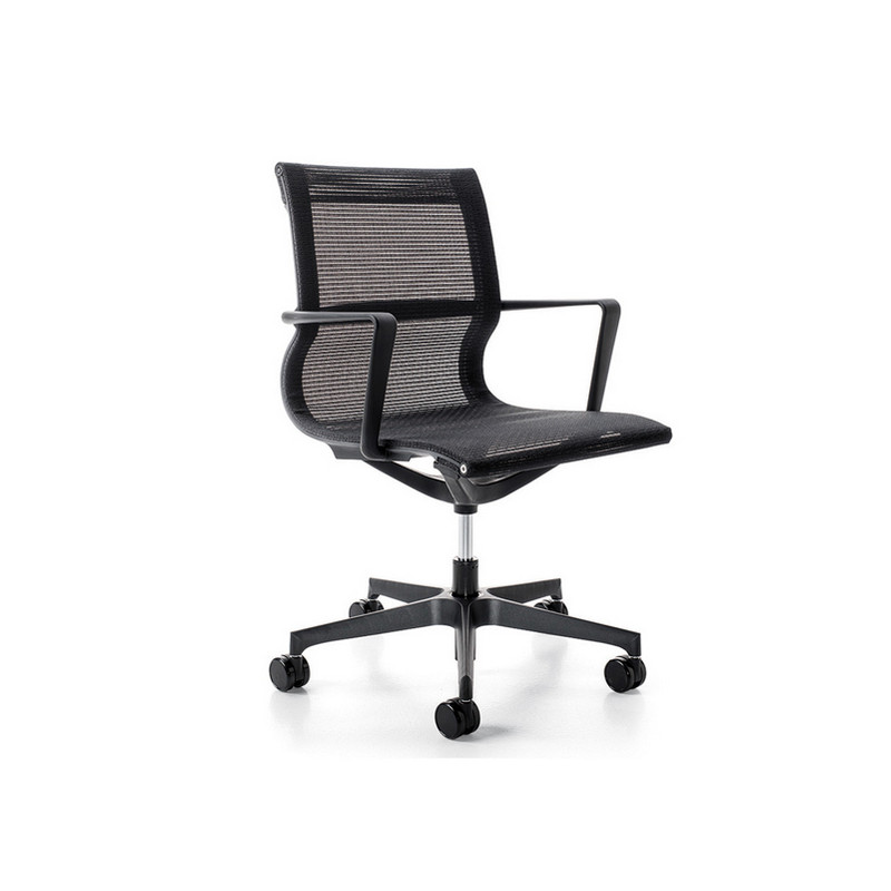 Poltrona dirigenziale tecnologica, ultra leggera in rete traspirante. Struttura integrale in nylon /poliammide, meccanismo oscillante libero e braccioli fissi. Elevazione a gas.