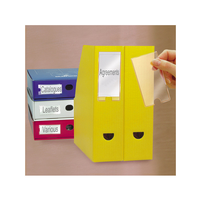 Portaetichette in polipropilene autoadesivi, permanenti e trasparenti, dotati di etichette di carta scrivibili, stampabili e intercambiabili. Comoda apertura a semicerchio che permette di inserire e rimuovere agevolmente gli inserti. Ideali per contrassegnare in modo semplice e rapido raccoglitori, registratori, archivi, ecc... Formato 62x150 mm.