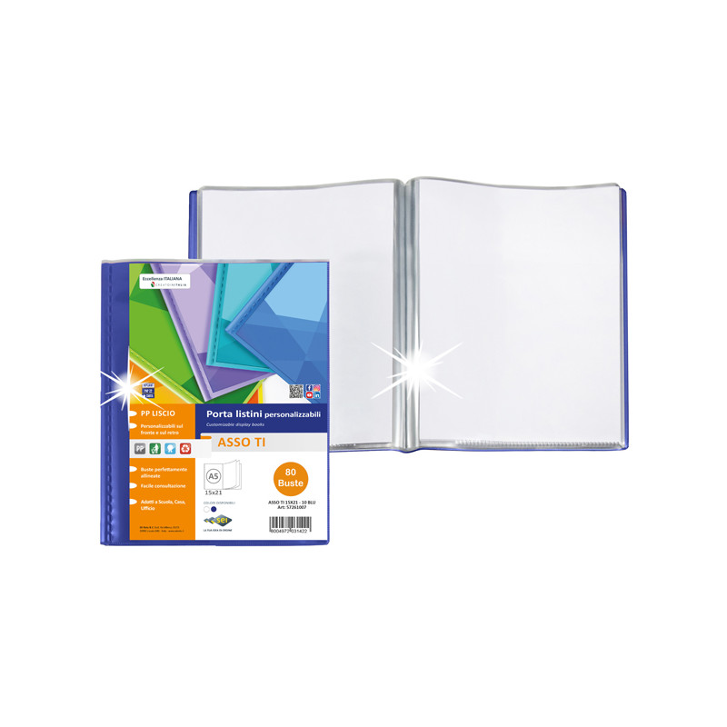 Porta listini A5 a 80 buste in PP liscio, con copertina e retro personalizzabili. Dorso blu. Il perfetto allineamento delle buste e la particolare saldatura facilitano la consultazione. Formato contenuto 150x210mm. Ideale per menù, libretti dei canti etc.