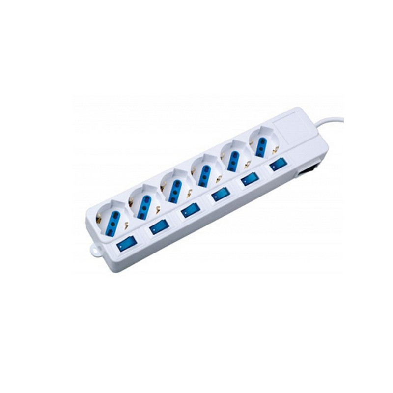Presa multipla bianca con interruttori singoli luminosi. Spina standard italiano 2P+T 16 A. 6 prese multistandard italiano/tedesco (bipasso/Schuko) 2P+T 10/16 A a ricettivitÓ multipla con alveoli schermati. Cavo: 3x1,0 mm¦, lunghezza 1,5 metri.