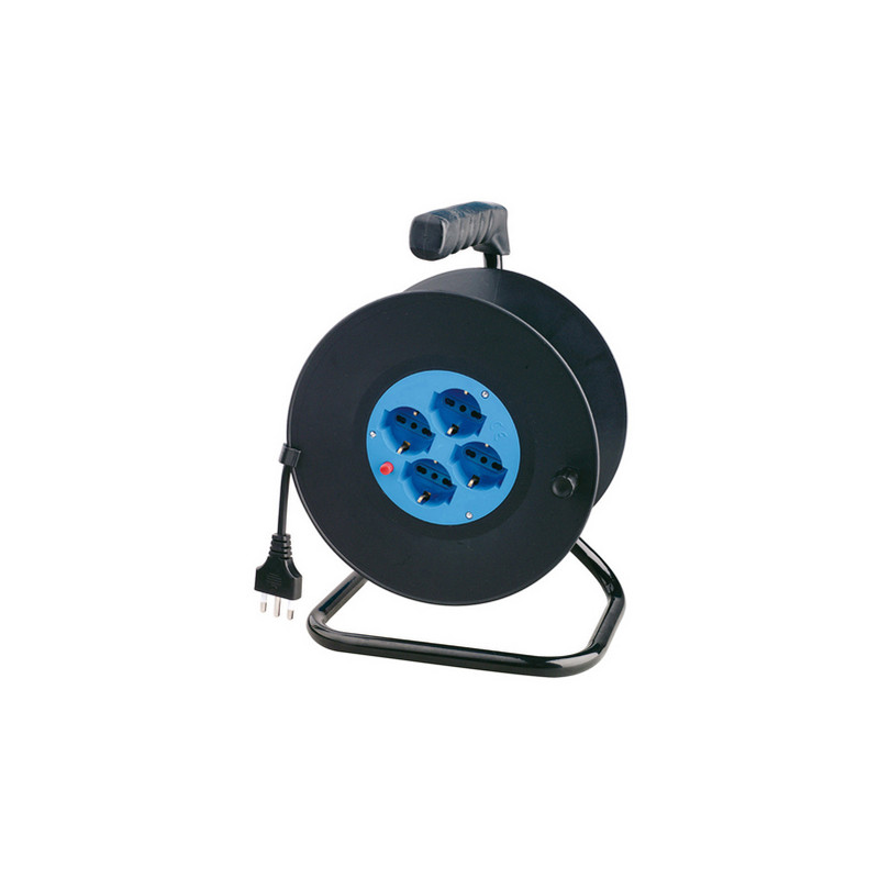 Prolunga elettrica in avvolgicavo con piedistallo e maniglia in metallo. Cavo: 3x1,5 mm¦, lunghezza 25 m. Spina da 16 A con protezione da sovraccarico. 4 prese bipasso/Schuko 10/16 A. Carico massimo 3600 W.