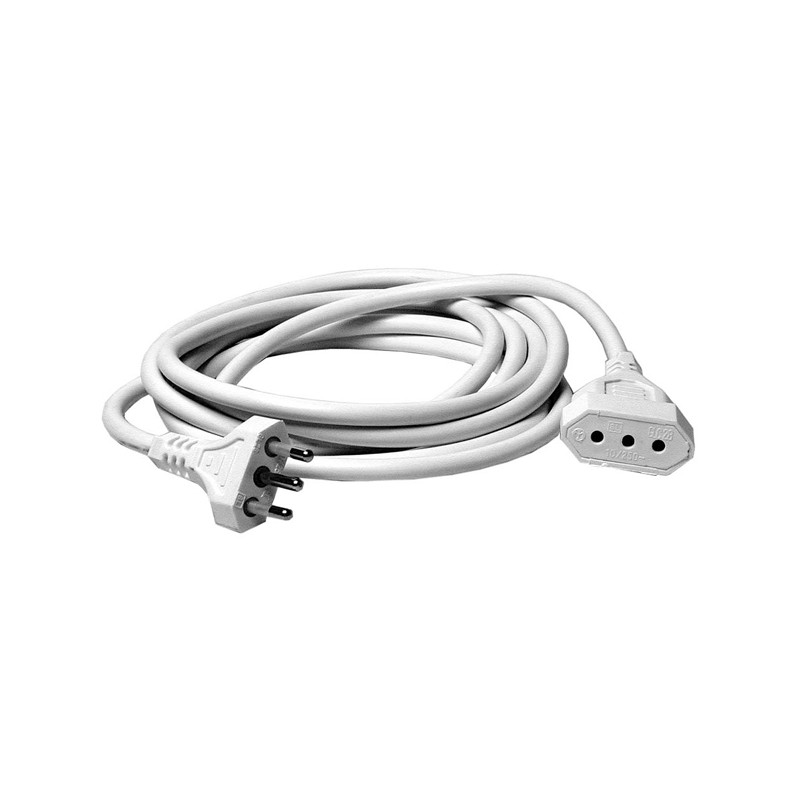 Prolunga elettrica di colore bianco. Spina standard italiano 2P+T 10 A. 1 presa standard italiano 2P+T 10 A con alveoli schermati. Cavo: 3x1,0 mm¦, lunghezza 5 m.