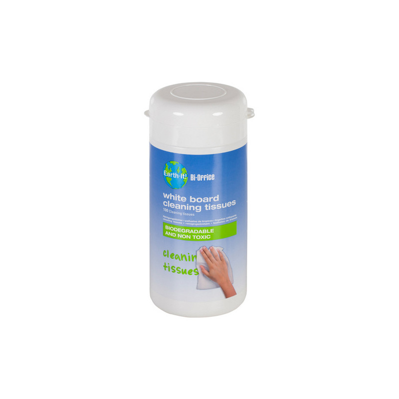 Contenitore apri&chiudi con 100 salviette di pulizia per lavagna bianca. Realizzate con prodotti riciclabili, imbevute con detergenti biodegradabili e non tossici