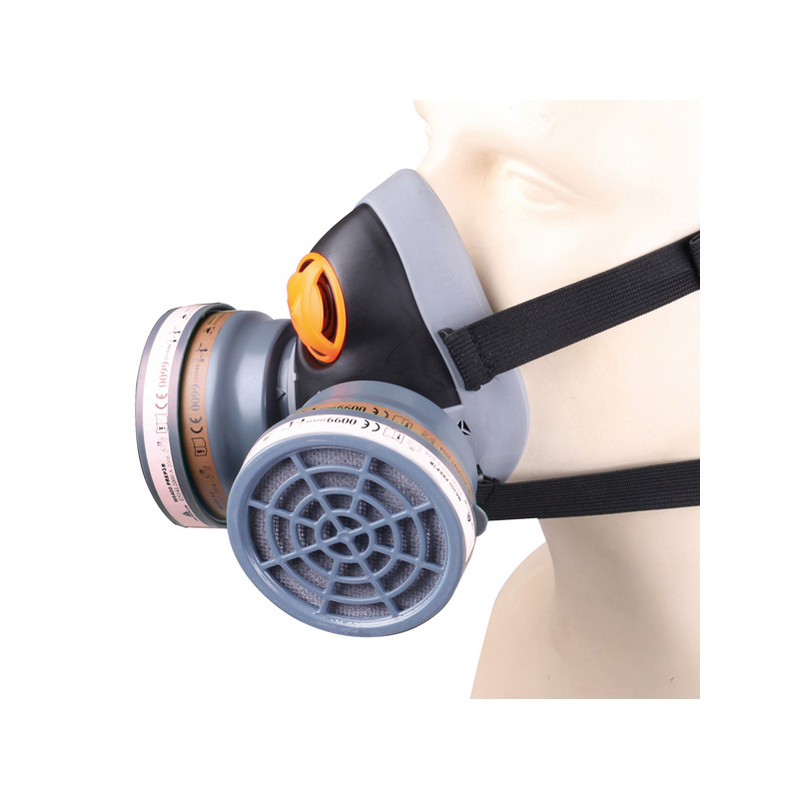 Semi-maschera bifiltri: corpo della maschera in polipropilene (PP) e in termoplastica. Munita di 2 filtri A2 e 2 prefiltri P3. Fasce elastiche. Corpo della maschera: polipropilene (PP) rivestito in termoplastica TPE. Bande: elastanne. Filtri: Corpo in plastica e carbone attivo. Prefiltri: Fibre sintetiche non tessute. Categoria DPI: 3. Certificazione CE. Conformità alle norme EN140:1998, EN14387:2004+A1:2008 e EN143:2000+A1:2006.