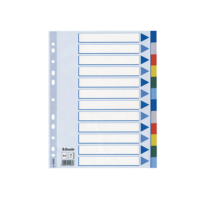 Separatori in Polipropilene colorato dotati di 12 tasti neutri multicolore. Indice frontale prestampato realizzato in cartoncino e rinforzato in Mylar sul lato forato. Perforazione universale. Formato A4.