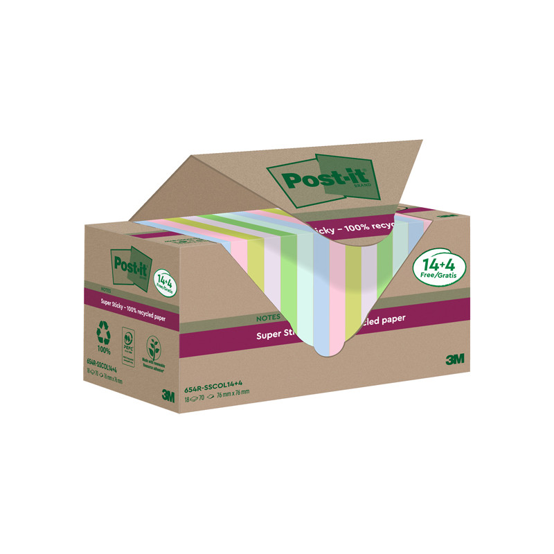Foglietti Post-it®SuperSticky Green in carta riciclata al 100%. Doppia forza adesiva rispetto al trazizionale. Confezione in carta riciclata. Blocchetti da 70 fogli colori pastello assortiti.