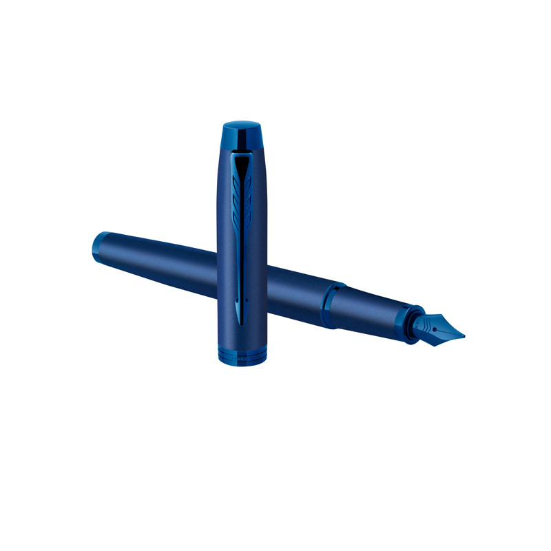 Stilografica Parker in acciaio inossidabile con finiture matatte blu e completata con finiture cromate. Confezionata in elegante astuccio regalo. Fornita con cartuccia colore blu.
