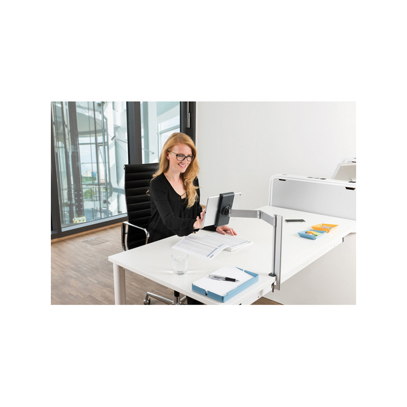Porta Tablet da banco. Adatto a tablet da 7” a 13”; Realizzato in materiali e finiture di altissima qualità; Inserimento e rimozione del tablet con una sola mano; Orientabile a 360° e posizionabile in orizzontale o verticale; Ergonomia assicurata dall’ampio angolo di visualizzazione; Robusto e stabile, con dispositivo anti-furto KSS; Sistema di cablaggio integrato; Design elegante e moderno, adatto ad ambienti formali.