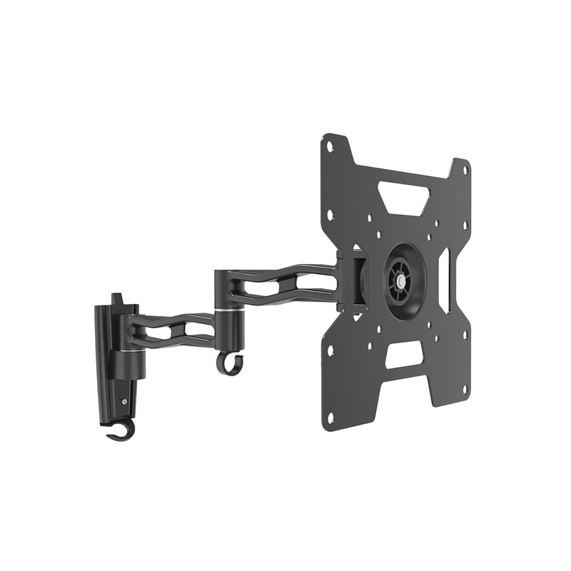 Supporto TV 17''-42'' a tre snodi nero. Carico massimo 30kg. Vesa 75x75 / 100x100 / 200x200. Inclinazione ±15°. Rotazione orizzontale 120°. Rotazione verticale 360°. Distanza dal muro 80-387mm. Piastra in pressofusione di alluminio e acciaio con livella integrata per posizionamento semplice. Due pezzi " slide-in " per un il montaggio facilitato. Sistema di gestione di routing cavi. Kit di fissaggio incluso.