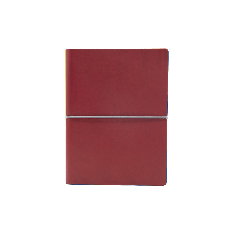 Taccuino con copertina in sintetico effetto liscio. Morbida, resistente e flessibile. Chiusura con elastico orizzontale. Carta riciclata colore avorio. Fatto a mano in Italia.