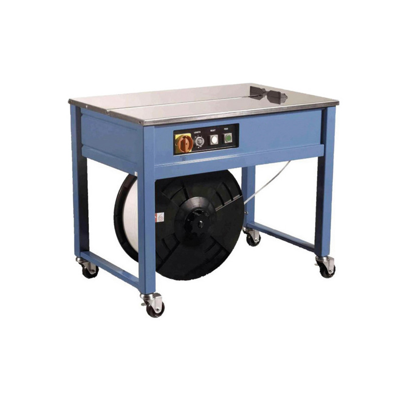 Reggiatrice semiautomatica a termosaldatura per reggette in plastica, alimentazione monofase 220V. Regolabile meccanicamente fino a 45 kg, velocità di reggiatura 2,5 sec/ciclo. Saldatura a caldo. Monta rotolo con diam. interno di 200mm. Larghezza reggia da 6 a 15,5mm. Peso 85 kg. Conforme alle direttive 2006/42/CE (Direttiva Macchine) e 2014/30/UE (Compatibilità elettromagnetica). Dimensioni: 90x58,6x76cm, peso: 85kg.