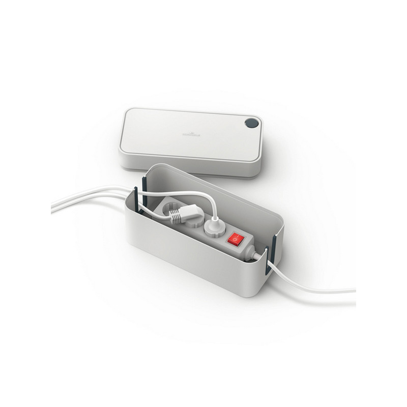 Scatola per nascondere cavi e multi prese da 3 entrate, realizzata in plastica ignifuga di alta qualità. Studiata per una gestione ordinata dei cavi, è dotata di fessure laterali che ne consentono il passaggio, inoltre facilitano la circolazione ottimale dell’aria. Il coperchio ha un’apertura passacavi circolare richiudibile ideale per cavi di ricarica dei telefoni cellulari.