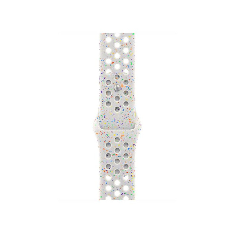 Il cinturino Nike Sport è robusto e allo stesso tempo sorprendentemente morbido e piacevole al tatto. I fori stampati a compressione lo rendono traspirante. In più, contiene minuscoli coriandoli che creano un pattern sempre diverso: non ne esistono due uguali. Il materiale, liscio e compatto, si adatta bene al polso ed è confortevole sulla pelle. Inoltre, ha un nuovo sistema di chiusura pin-and-tuck in alluminio con finitura opaca.