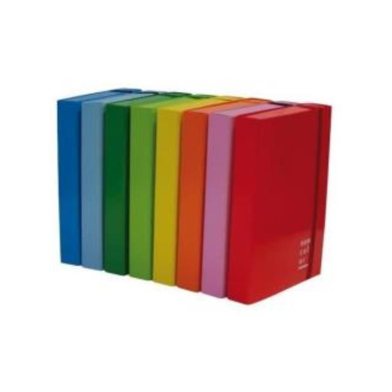 Cartelle rivestite in carta monopatinata plastificata, con 3 lembi e chiusura con elastico piatto in tinta.