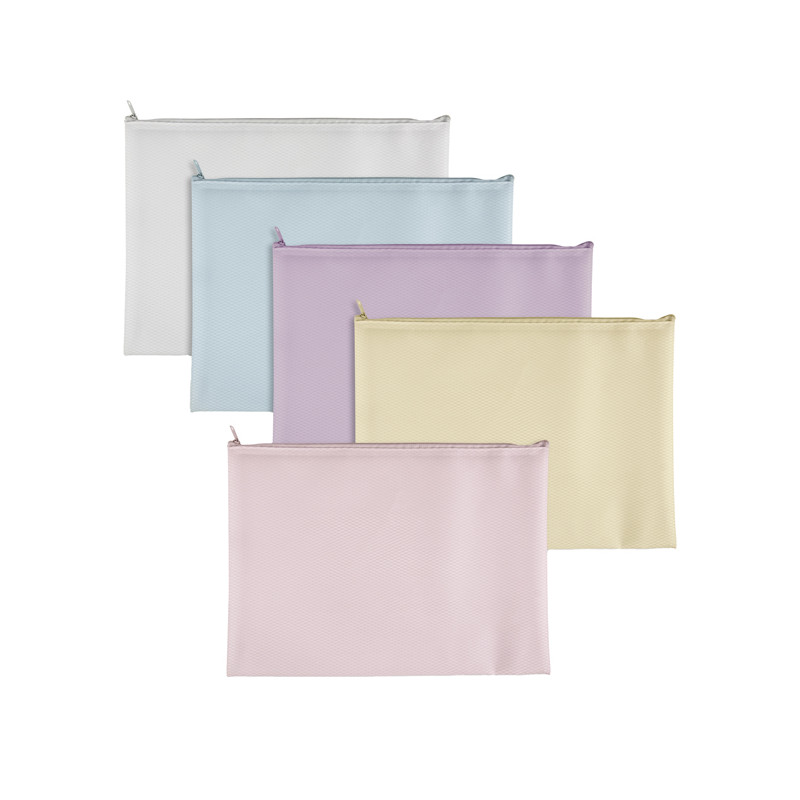 Buste realizzate in plastica EVA morbida di alta qualità, resistente e durevole. Dotate di comodo zip di chiusura in tinta. Fornite in 5 colori pastelli assortiti (lilla, rosa, azzurro, giallo e grigio).
