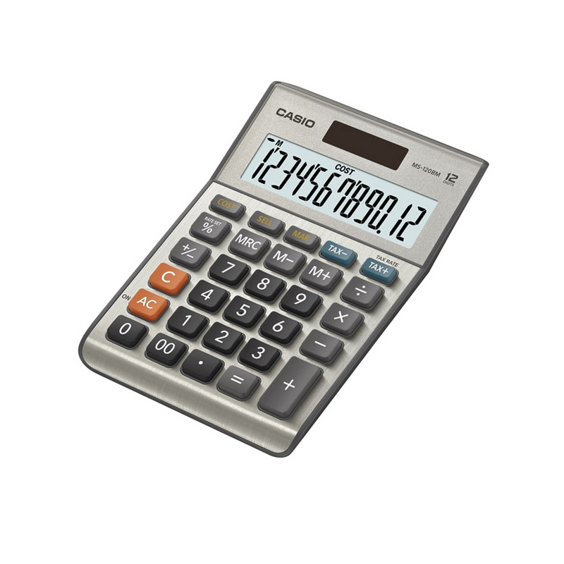 Calcolatrice da tavolo con facciata in metallo. Display LC a 12 cifre. Tasti in plastica. Doppia alimentazione solare e a batteria (1xLR1130). Calcolo percentuale incluso il margine di profitto. Calcolo delle imposte. Calcolo del profitto (costo, vendita, margine). 3 tasti memoria. Tasto simbolo +/-. Tasto doppio zero. Key rollover. Autospegnimento. Indicatore comando funzione. Separatore di migliaia.Dimensioni 28 x 10,1 x 14,9 cm. Peso 120gr.