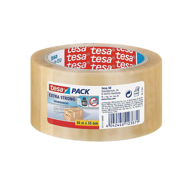 Tesapack Extra Strong: nastro di imballaggio extra forte e trasparente in robusto PVC di qualità per imballaggi sicuri di cartoni pesanti, buste imbottite e cartoni