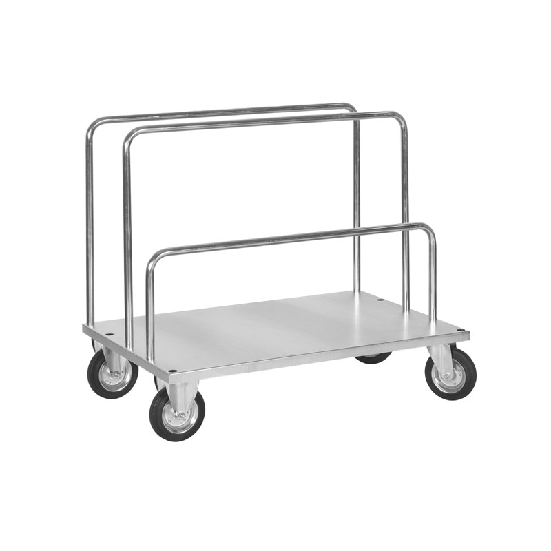 Carrello in lamiera di acciaio zincato con 2 barre alte e 1 bassa idoneo per il trasporto di carichi lunghi quali barre, profili, rotoli di tessuto, ecc. Pianale sp. 15/10 rinforzato, con 5 fori per lato che consentono l’innesto di barre di carico in tubo di acciaio diam. 30, disponibili in 2 altezze di 40cm e 80cm. Ruote diametro 20cm con cuscinetti (2 fisse e 2 girevoli). Portata 450kg (per carichi uniformemente ditribuiti). Dimensioni: 120Lx80Px64/104Hcm. Fornito smontato.