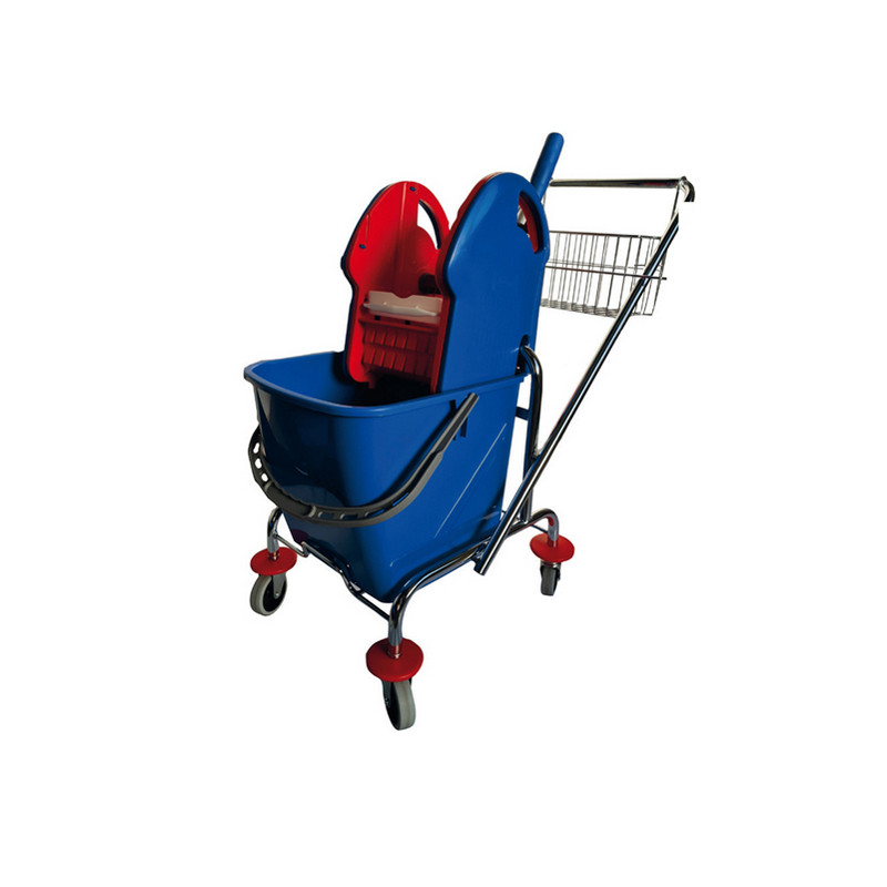 Carrello mono cromato lt.25 con impugnatura alta. Composto da: Telaio cromato con ruote Ø 80 mm; Secchio lt.25; Cestino cromato; Strizzatore in plastica con ingranaggi in nylon. Dimensioni :41x58x93cm. Adatto per alberghi, stazioni ferroviarie, ospedali, centri commerciali.