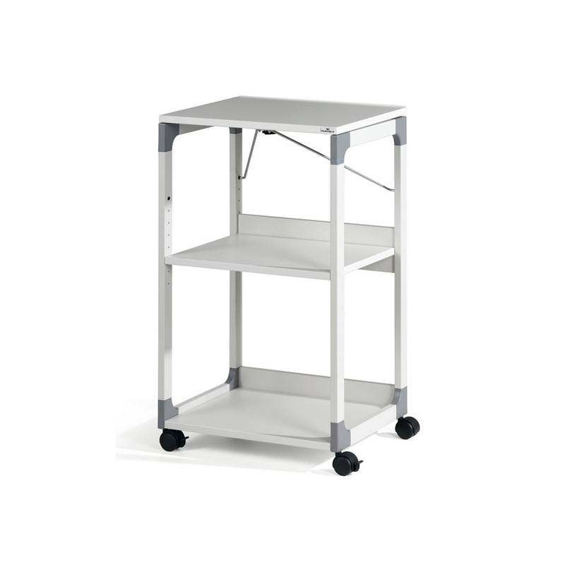 STRUTTURA IN ACCIAIO VERNICIATO CON POLVERI EPOSSIPOLIESTERE ANTIGRAFFIO E RACCORDI ANGOLARI IN PLASTICA RESISTENTE. 3 RIPIANI CON MENSOLA SUPERIORE REGOLABILE IN ALTEZZA. SE USATO CON PROIETTORE "OVERHEADS", LA MENSOLA PUO' ESSERE SPOSTATA LETERALMENTE PER APPOGGIARE IL PROIETTORE SULLA MENSOLA CENTRALE. MENSOLA CENTRALE REGOLABILE (PASSO 32CM) E MENSOLA INFERIORE FISSA. Ogni ripiano ha portata max 30kg. DOTATO DI 4 RUOTE PIVOTTANTI DI CUI 2 BLOCCABILI. DIMENSIONI: L 508 X P 432MM - H 882MM.