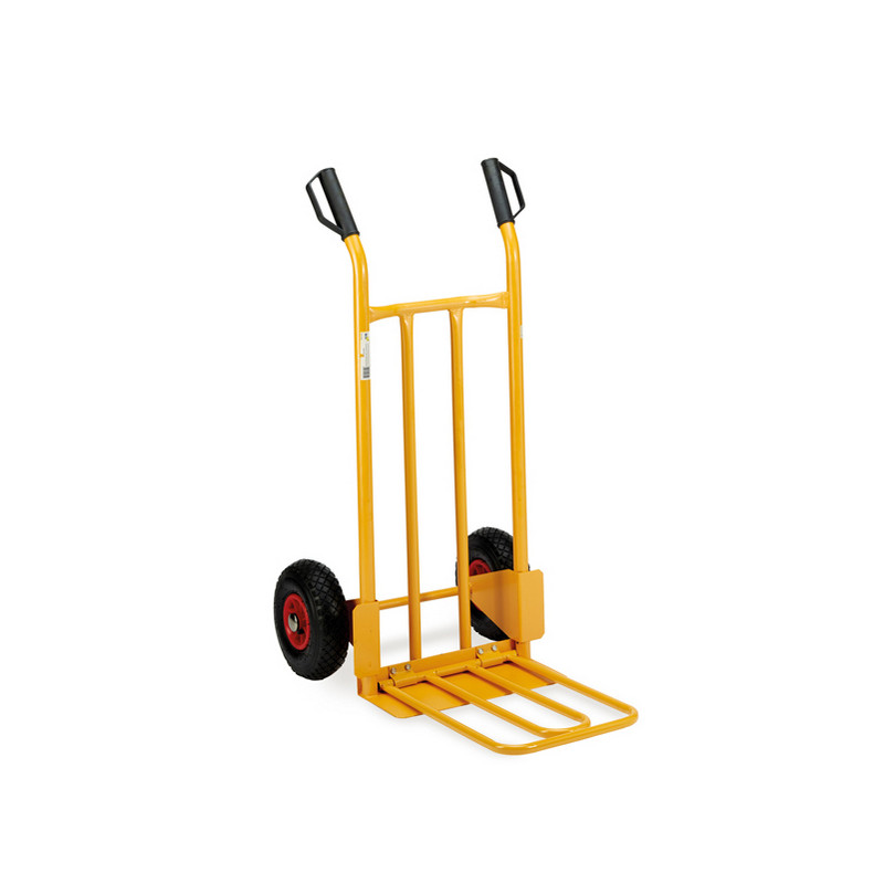 Carrello in acciaio rinforzato verniciato di colore giallo, manopole con paracolpi, completo di ruote pneumatiche. Portata massima 300 kg. Dimensioni: L56xP17x110Hcm + 50cm pala. Ruota di ricambio cod 91872. Articolo destinato ad esclusivo uso domestico. Non adatto ad uso pubblico.