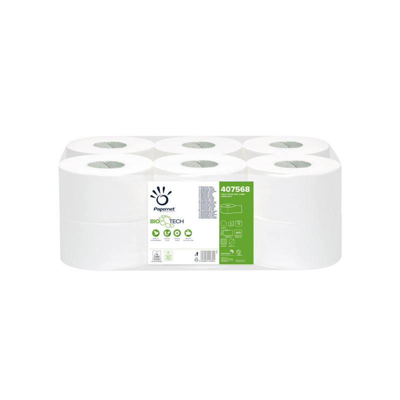In pura cellulosa 2 veli microgoffrata. Adatta a distributori minijumbo. °19,5cm h9,5cm - 405 strappi da 37x9,5cm. Prodotta con l'esclusiva tecnologia batp (biologic active tissue paper).