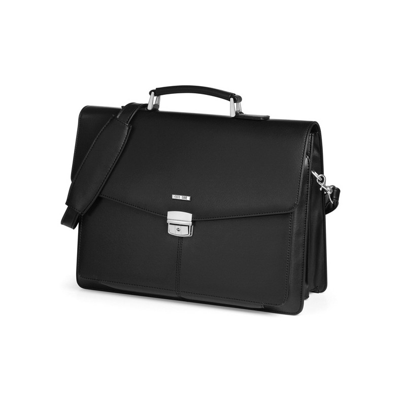 Cartella in similpelle dotata di tre scomparti di cui uno imbottito per note-book e divisorio interno con cerniera, grande tasca frontale con cerniera e vani portaoggetti. Completa di tasca posteriore con cerniera e tracolla regolabile.