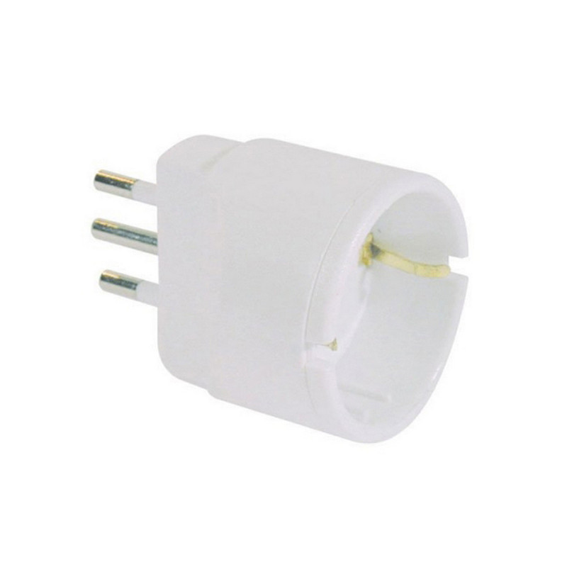 Adattatore semplice, spina standard italiano 2P+T 10 A, presa con alveoli schermati standard tedesco (Schuko) 2P+T laterale e centrale 10 A. Certificato IMQ.