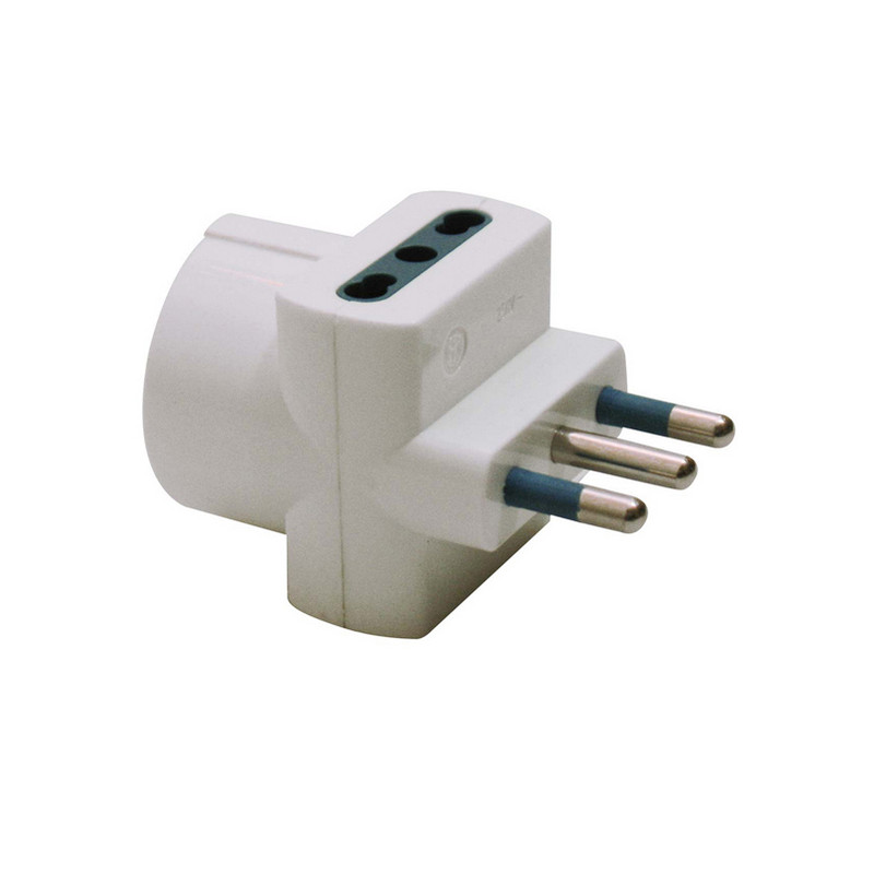 Adattatore di rete triplo, spina standard italiano 2P+T 16 A, 2 prese con alveoli schermati a ricettivitÓ multipla standard italiano (bipasso) 2P+T 10/16 A, 1 presa frontale con alveoli schermati standard tedesco (Schuko) 2P+T laterale e centrale 16 A.