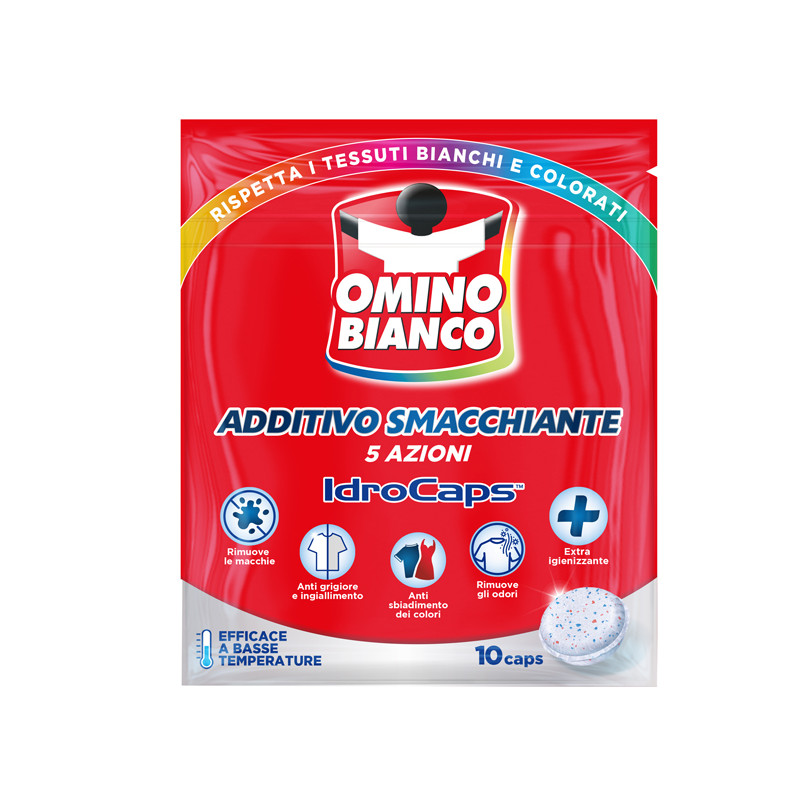Omino Bianoc Additivo totale Idrocaps 5 in 1 è il primo additivo in comode caps idrosolubili che si dissolvono completamente durante il lavaggio senza lasciare residui o aloni. Sono pronte all’uso, da inserire direttamente nel cestello della lavatrice, per un bucato pulito in un solo gesto. La sua speciale formula concentrata ti garantisce il miglior risultato di sempre grazie all’efficacia delle sue azioni: