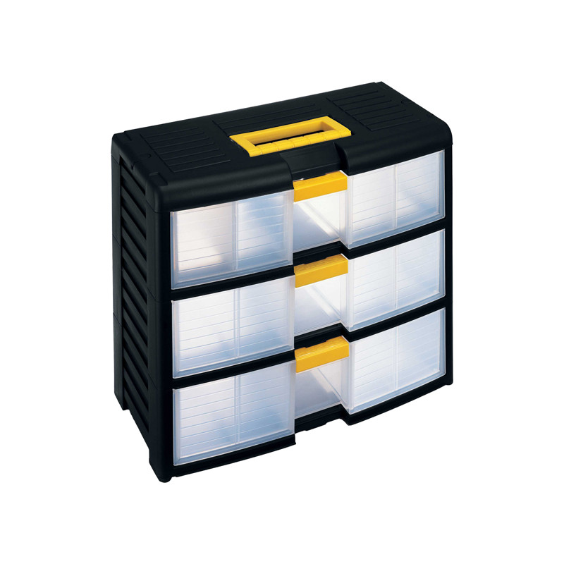 Cassettiera modulare trasportabile con maniglia ergonomica a scomparsa. 3 cassetti di altezza 10cm. 6 divisori mobili e chiusura brevettata Block-Age®. Colore: nero/trasparente. Dimensioni: 39,1x19,7x33,4cm (LxPxH). Materiale: polipropilene con chiusure in ABS. Peso: 2,383kg.