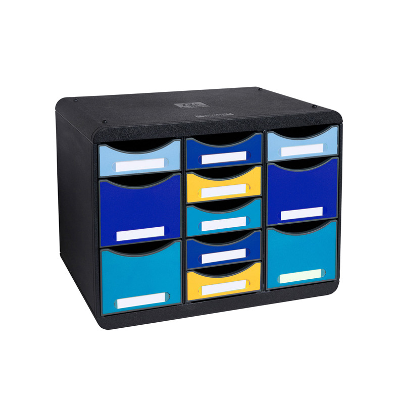 Cassettiera da scrivania. Formato orizzontale. Monoblocco, ultrarigida. Cassetti con blocco d'arresto e aperti per consentire l'inserimento diretto dei documenti. Formato esterno: 270X355X271mm. Portaetichetta in dotazione, sovrapponibile grazie a 4 piccoli incastri. 11 cassetti: 7 piccoli + 4 alti.