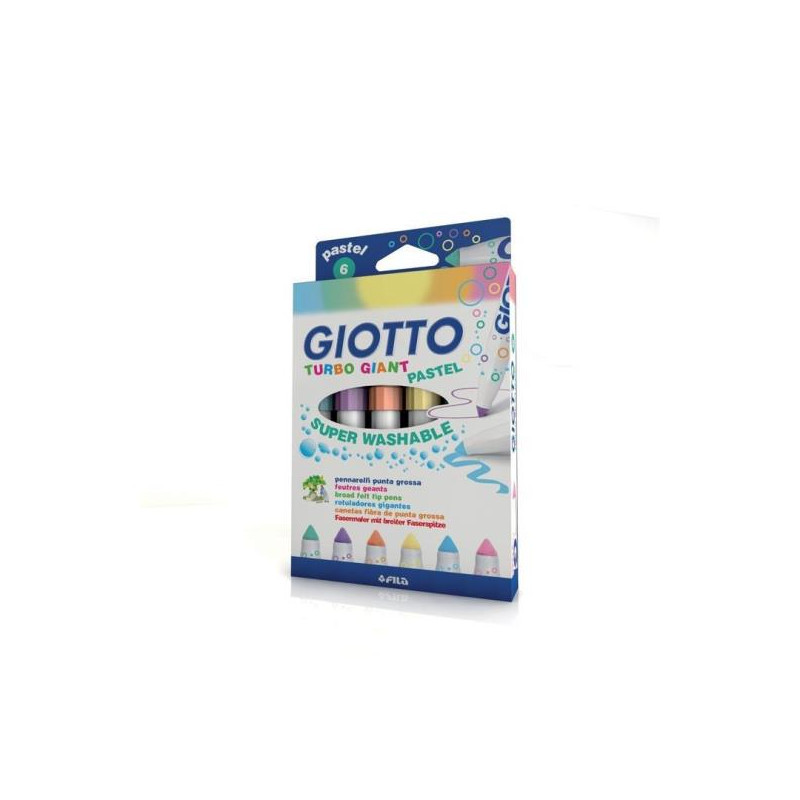 GIOTTO TURBO GIANT il pennarello extra large con punta conica che permetti di realizzare ampie campiture di colore inclinando la penna e di tracciare linee fini utilizzandola in posizione verticale. Una novità di sicuro interesse grazie anche alla speciale gamma cromatica: astuccio 12 pennarelli con 10 colori classici e 2 colori fluo e astuccui con 6 colori con speciali inchiostri color pastello.