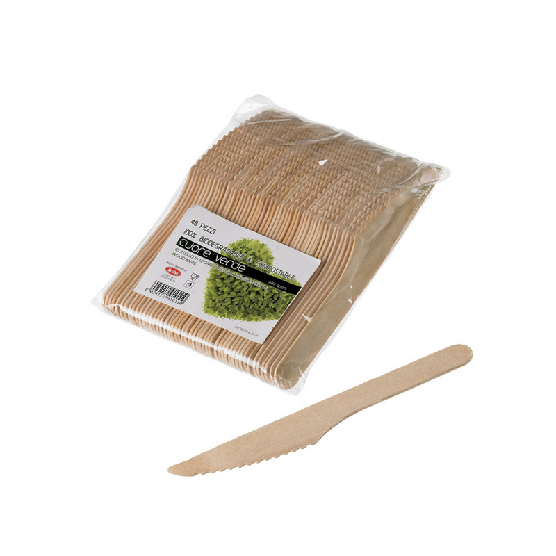 Coltelli in Legno di betulla, non contiene vernici, additivi e sostanze sottoposte a restrizioni per il contatto alimentare. Adatto a cibi caldi e freddi, solidi e liquidi. Biodegradabile naturalmente,