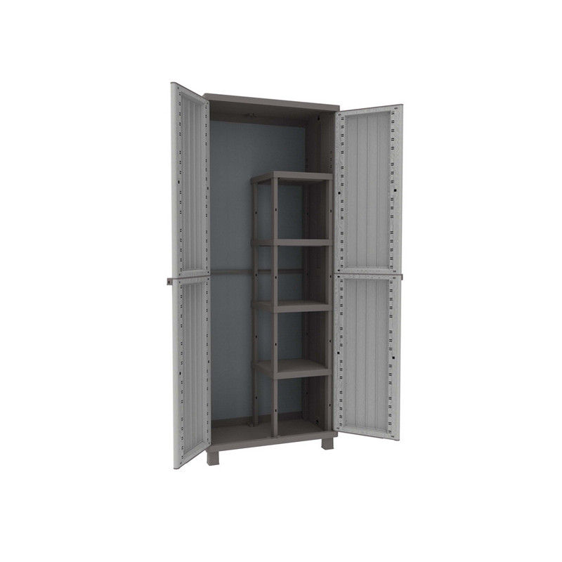 Linea di armadi modulari con robusta struttura in PPL ed elegente finitura legno color tortora. Gli armadi hanno ante apribili a 180° e ripiani regolabili. Piedini rialzati e predispozizione per il lucchetto. Adatto sia per ambienti interni che esterni. Armadio a 2 ante portascope conscaffalino interno a 4 ripiani. L68cmx P37,5 cm.xH170 cm.