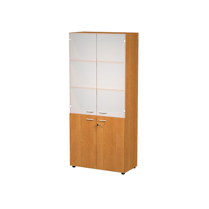 Armadio a 2 ante battenti in melaminico con serratura + 2 ante vetro senza serratura. 3 ripiani spostabili + 1 fisso. Dimenzioni: L90 x P45,8 x H200 cm. Linea di armadi componibile particolarmente robusti e stabili, costituiti da struttura alta 200cm e completabili con sopralzo alto 40cm. Grande profondità di 46cm e larghezza di 90 cm. Struttura spessore 18mm. Lato posteriore rifinito da ambo i lati con pannello rigido in spessore 10 mm. Ripiani interni in sp. 25mm. Piedini regolabili per la massima stabilità.